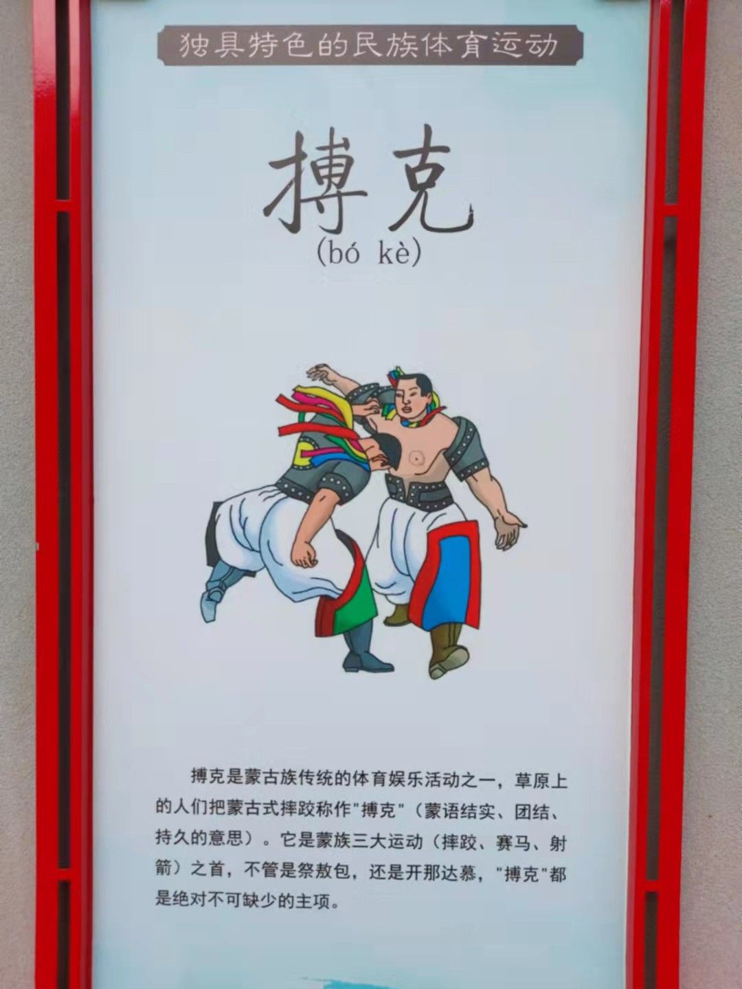 搏克是蒙古族傳統的體育娛樂活動之一,草原上的人們把蒙古式摔跤稱作"搏克”(蒙語結實、團結、持久的意思) .它是蒙族三大運動(摔跤、賽馬、射箭)之首,不管是祭敖包,還是開那達慕,"搏克"都是絕對不可缺少的主項。