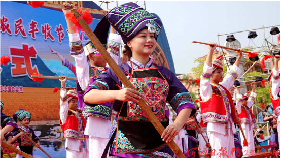 都安瑤族自治縣群眾打起扁擔,歡慶“中國農民豐收節”。