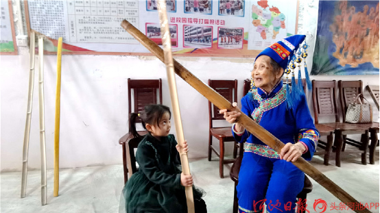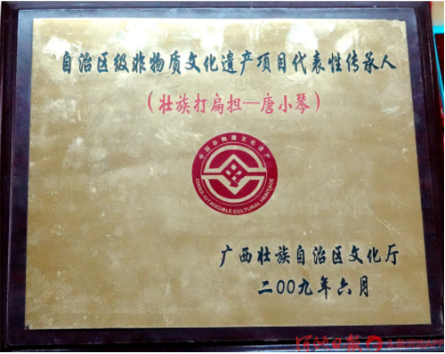 今年已經88歲高齡的“壯族打扁擔”技藝傳承人唐小琴,她從小即耳濡目染,跟村里老人、長者學習打扁擔,后因打扁擔需要指揮,又學習皮鼓打法。1961年4月,唐小琴從學校調入縣文化館任文化藝術輔導員,挖掘整理了《壯族打扁擔》《板凳舞》《斑鳩舞》等一大批傳統舞蹈,并多次在自治區、河池地區的比賽、調演上獲獎。1986年退休后,仍然致力于《壯族打扁擔》的傳承工作,2004年,組建都安縣老干康樂藝術團,帶動安陽鎮退休老人學習打扁擔技藝。2009年,她被確認為自治區非物質文物遺產項目“壯族打扁擔”代表性傳承人。