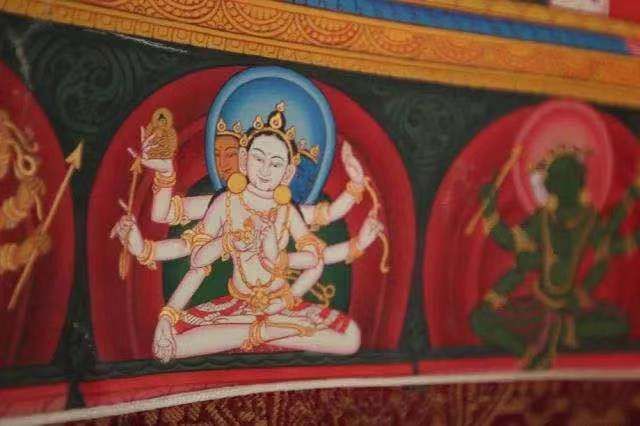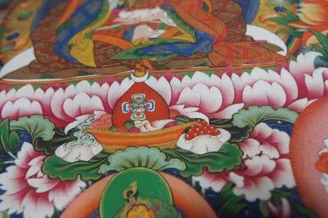 900多年前流傳于衛藏地區(現山南)的齊烏崗派唐卡,由雅堆·齊烏崗巴創立,與嘎瑪嘎赤畫派、勉塘畫派、欽孜畫派、埃赤畫派并稱“唐卡五大畫派”。齊烏崗派特點為人物體形飽滿、生動細膩,色彩以棗紅、橘紅暖色系為主;中央的主尊突出,背景多用卷草紋作為裝飾。特別是,齊烏崗派唐卡的佛像肩膀旁都有象征翅膀的“三角”,源于創始人齊烏崗巴行動靈敏,亦被稱作“齊烏派”。