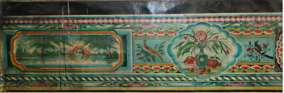 達拉特旗地區的墻圍畫高度一般在70厘米左右,其長度則依炕的大小而定。炕上部分的畫是主體,在結構上有一套固定的模式,即以上下兩組邊道,按照一定的規格布置形成主體框架,中間等距離安排各種畫空,既具完整對稱的裝飾形式美感,又具簡繁對比、主從相映的豐富表現內涵。邊道圖案種類繁多,有折子邊、卷帶邊、竹筒邊、花邊等。畫空也稱“池子”,有正方形、長方形、扇形、圓形等多種形式。此外,在下邊道與炕距離25-30厘米的范圍內是黃顏色的邊子,這樣的設計是避免炕上物件的遮擋和抬高人的視線,便于觀賞。