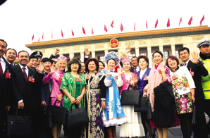 十三屆全國人大一次會議開幕前,少數民族代表身著盛裝,在人民大會堂前留影。 本報記者 張國欣攝