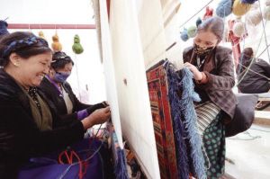 山南市瓊結縣農牧民在襄陽援藏工作隊引進的西藏薩喜欽布公司編織藏毯。 湖北省民宗委供圖