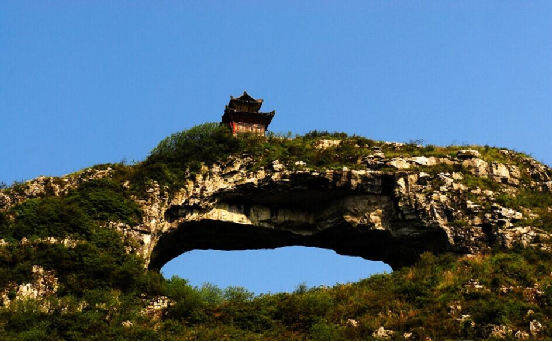 仙橋山位于貴州甕安縣城西南5公里的仙橋村,雄峙于南北伸展的長嶺之巔。山頂有一長方形穿洞,遠望似一面中天明鏡,又若仕女發髻上的一匹玉簪。民間傳說,那高懸的“橋洞”,是神通廣大的仙人張三豐發怒時一拳擊穿的。站在“橋”下仰望“橋”頂,如巨粱橫亙天際,青崖黛壁,輝映云天。天衣無縫的“橋身”和兩邊的“橋墩”,渾然一體,構成跨度約40米,寬20米,高約35米的“橋拱”。“橋拱”北面的“橋墩”腳有形狀各異的石洞,曲徑相通。洞壁有形似人腳印石凹,傳說是仙人張三豐到此云游留下的足跡。