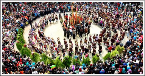 蘆笙踩堂開始時(shí),首先舉行開堂儀式,向蘆笙柱祭祀。蘆笙柱是苗族的圣物,用高達(dá)10米以上的完整杉木制作而成,柱頂立一只錦雞(苗族崇拜的一種鳥),雞頭向東,寓意吉祥;柱身盤著一條金龍,體現(xiàn)苗族與漢族的文化融合;還有苗族崇拜的牛角和十字架。寨老和蘆笙頭分別敬上三杯酒和燒三柱香,感謝神靈和祖宗保佑,祈求坡會成功、新年萬事如意。緊接著,蘆笙頭拿起小蘆笙,圍繞一個(gè)曲調(diào)反復(fù)吹三遍,拉開蘆笙踩堂表演的序幕。