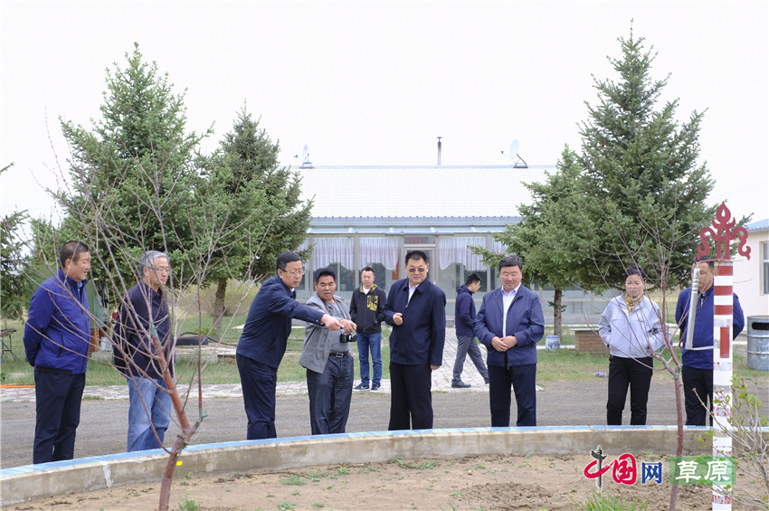 廷·巴特爾向前來考察調研的全國政協人口資源環境委員會副主任任亞平(右四)、錫林郭勒盟委書記羅虎在(左三)介紹牧場情況
