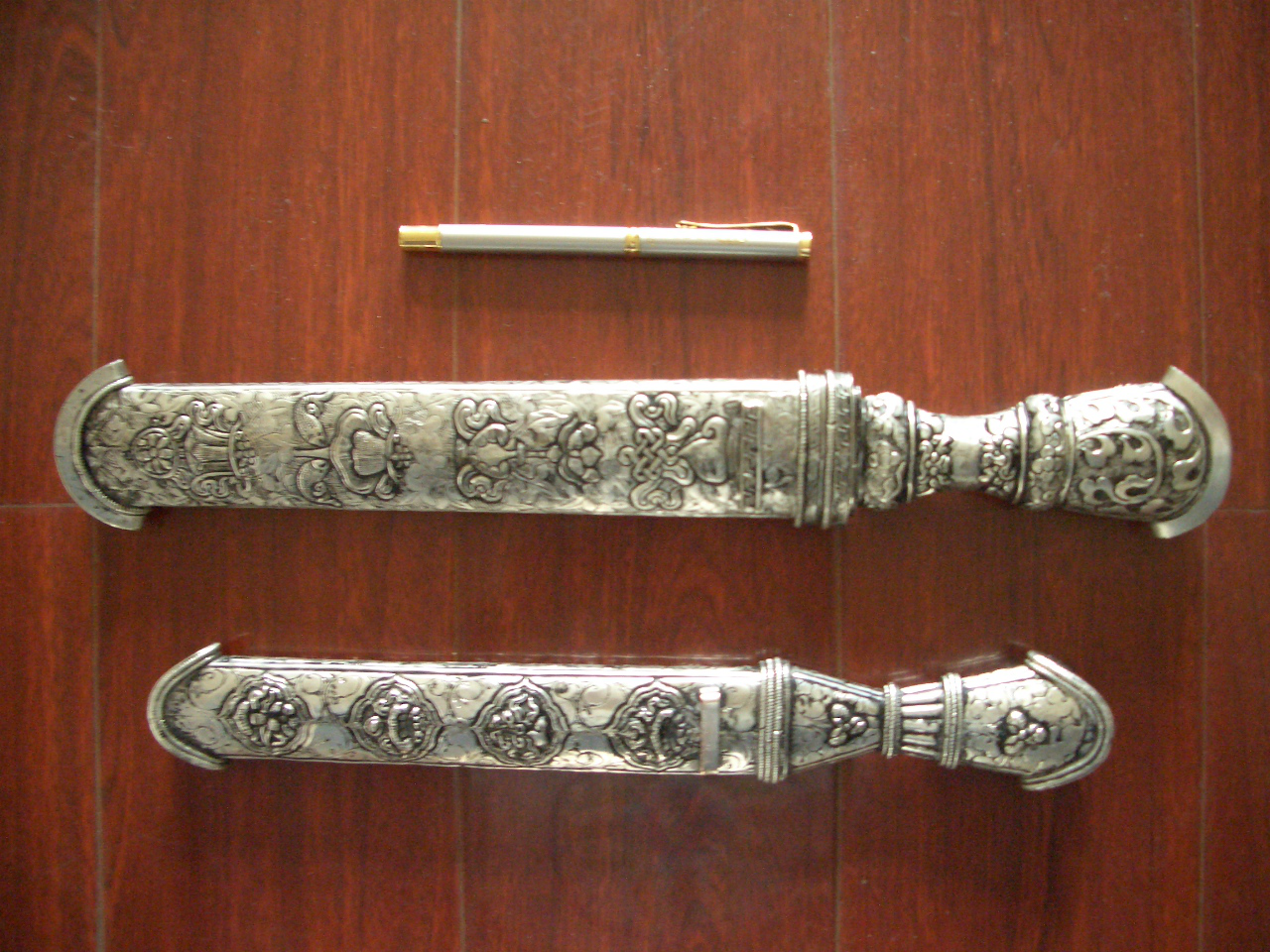 藏刀具有生產、生活、自衛、裝飾4種用途,已有1600多年的生產歷史,做工講究,刀身用鋼材鍛,刀柄用牛角或硬質木料加工而成。從規格尺寸上分,藏刀大致為長刀、短刀和小刀三種。長刀最長的有一米多,短刀約40厘米左右,小刀則僅有十幾厘米長。從形狀上講,具有很強的地方特色,有牧區式、康巴式、后藏式等區別;用途也有很多種,如林區砍樹有專門的砍樹刀,屠夫用的屠宰刀等。 藏刀把多用以牛角、牛骨或木材制成,較高檔的刀把用銀絲、銅絲等纏繞,刀鞘則更為講究,較簡單的有木鞘或皮套外,多數是包黃銅、白銅,甚至包白銀、鍍金等,上面刻有精美的飛禽走獸及花草等各種圖案,有的還鑲嵌各種寶石、彩石,顯得華麗和富有。拉孜生產的藏力,歷史悠久,樣式美觀,淬火適中,刀刃鋒銳,再配上精致、貴重的刀鞘,雕著龍、鳳、虎、獅和錦花圖案,精美的藏刀大都出自能工巧匠之手。由于鍛打精致,鐫刻細膩,色彩奪目,并附有藏文,系有五顏六色柄穗,形成別具一格的藏族工藝品。藏刀的主要加工材料有銀、銅(白銅、黃銅、紫銅)、鐵、鯊魚、牛角、瑪瑙、硬雜木等。過程有冶煉熔化、模具翻鑄、敲摳大形、刻花鑲嵌、焊接組合、加固、銼磨整形、精雕細刻及鎂洗拋光等工序。
