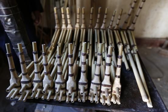 與舞臺表現所用的十幾管甚至二十幾管的蘆笙不同,高坡蘆笙主要是苗族傳統的六管蘆笙,分為大中小不同型號。蘆笙的制作材料為苦竹(蘆笙竹),原來主要產于貴定縣鞏固鄉的楊柳塘,1985年后,他們從楊柳塘將蘆笙竹移栽至高坡鄉批林等地,成為目前制作蘆笙的主要原料。