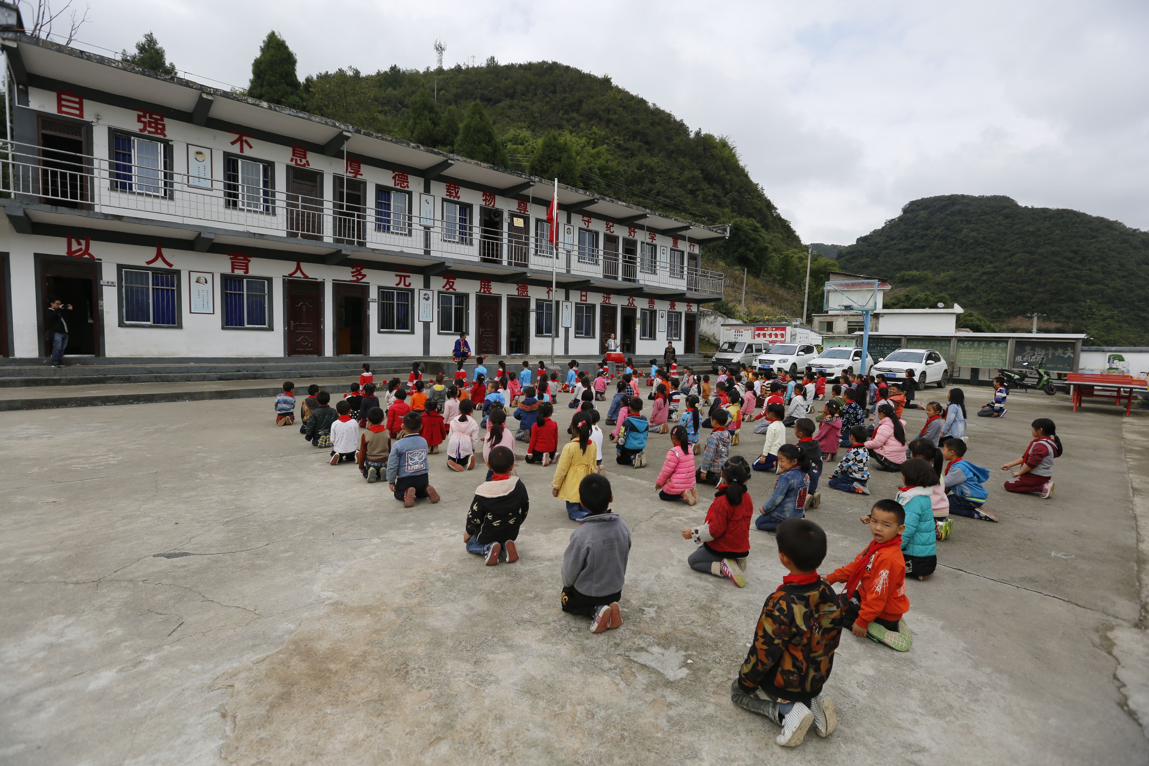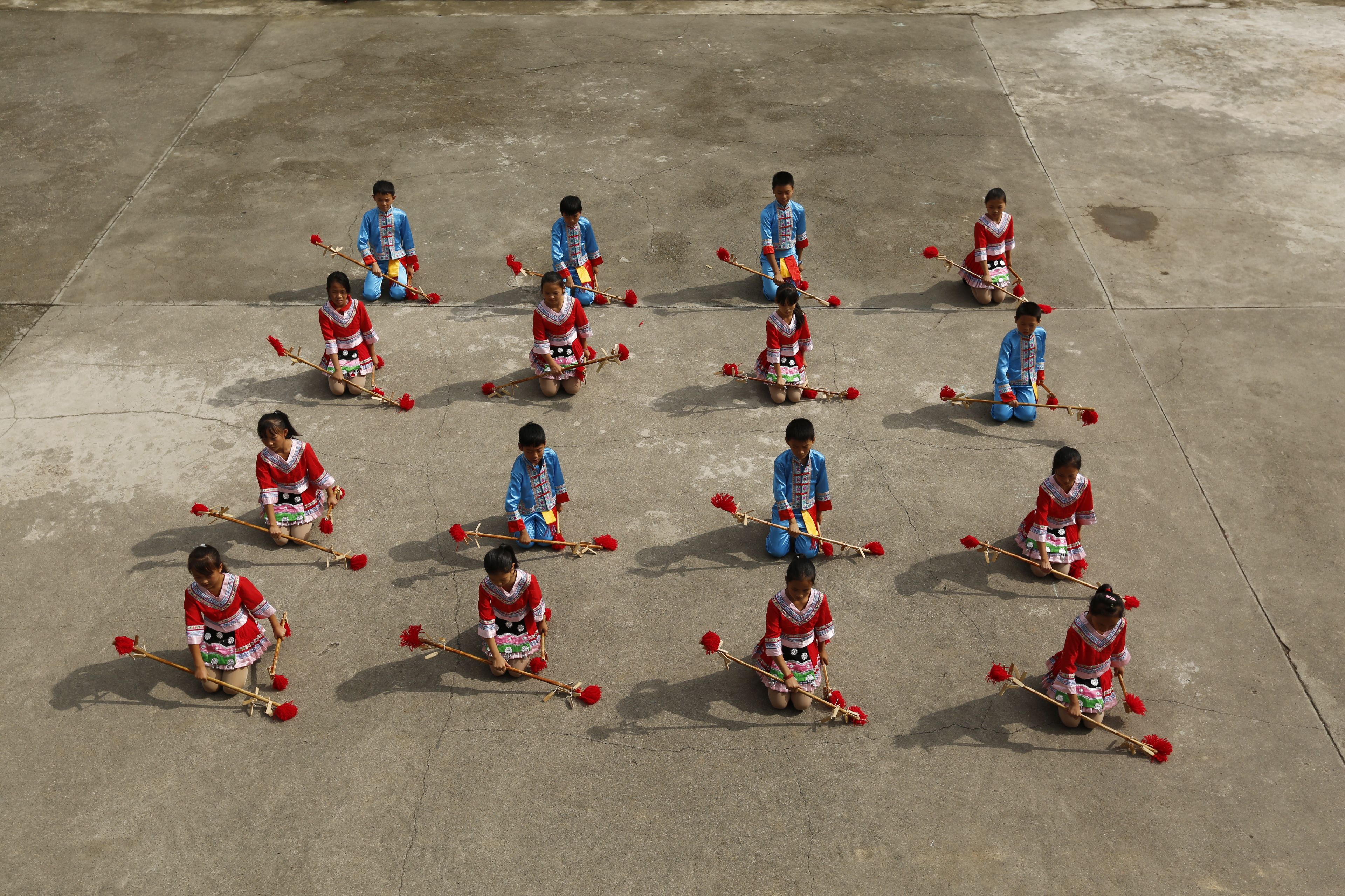 圖片說明:貴州貴陽苗族長竹舞傳承人教孩子們跳長竹舞